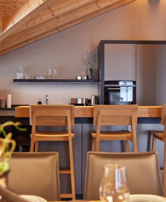 Der große Wohn- und Essbereich bildet das Herzstück des Apartments und ist ideal für gesellige Abende oder entspannte Stunden in exklusiver Atmosphäre. Die voll ausgestattete Küche lässt keine Wünsche offen.