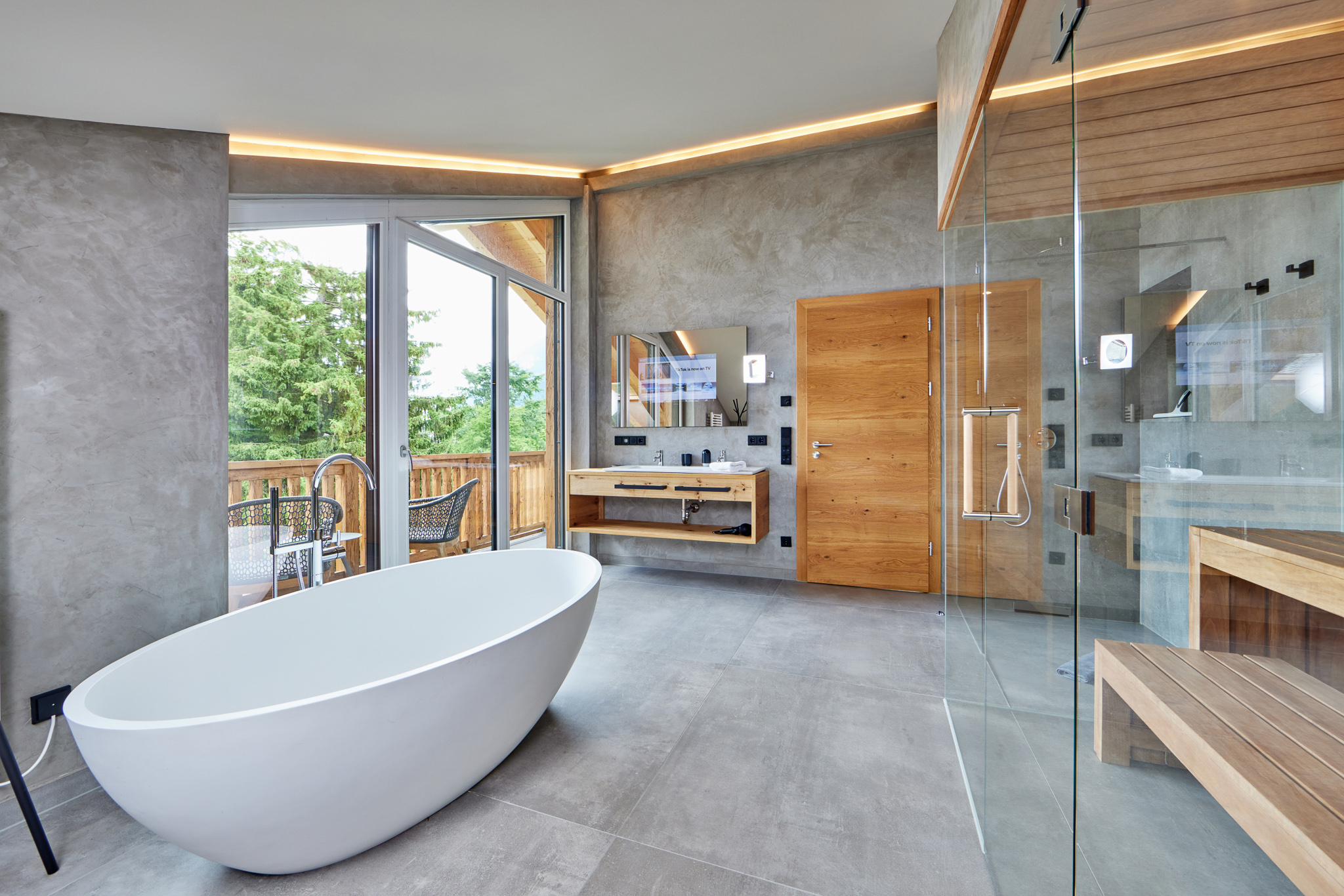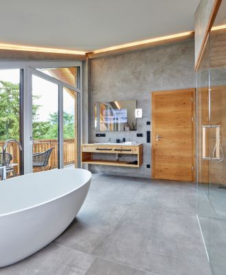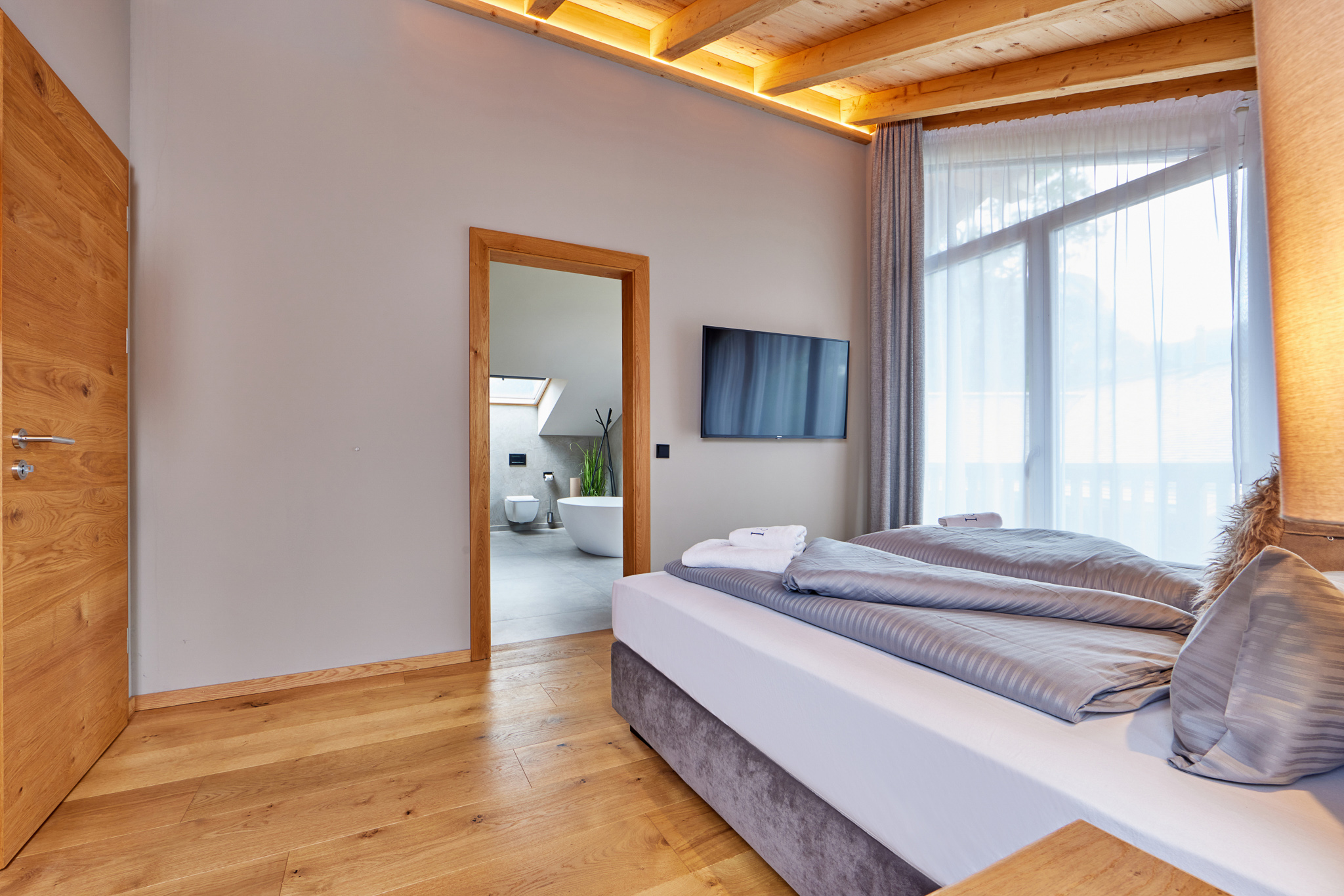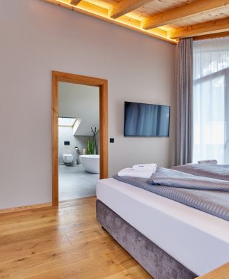Modernste Annehmlichkeiten wie Fußbodenheizung, Klimaanlage und Balkone für jedes Zimmer sorgen ganzjährig für ein angenehmes Klima und bieten private Aussichtspunkte auf die malerische Umgebung.